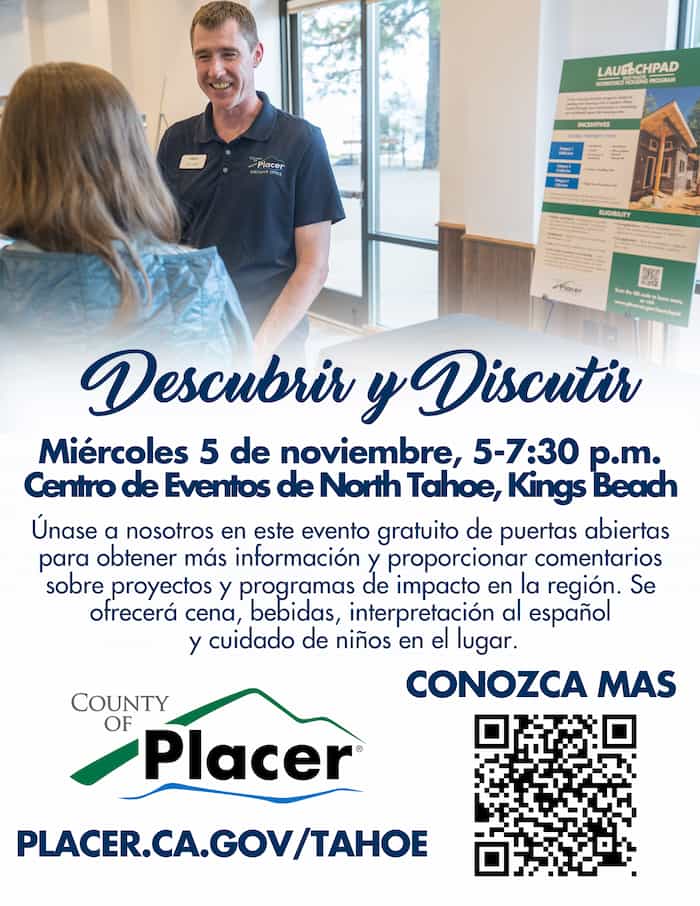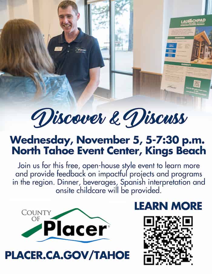 Join Placer County and local partners for Discover & Discuss, an open-house community event on Wednesday, November 5, from 5–7:30PM at the North Tahoe Event Center.