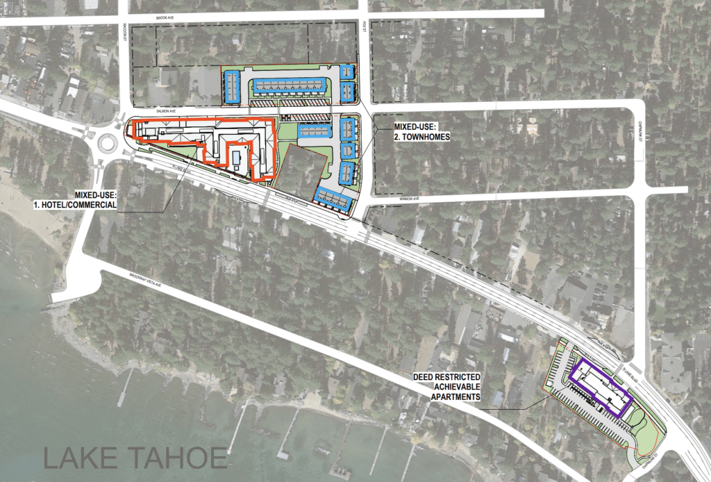 A third component of the proposal introduces 64 achievable housing apartments, which are proposed on a separate parcel farther east along North Lake Boulevard near Chipmunk Street.