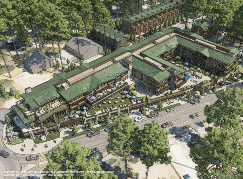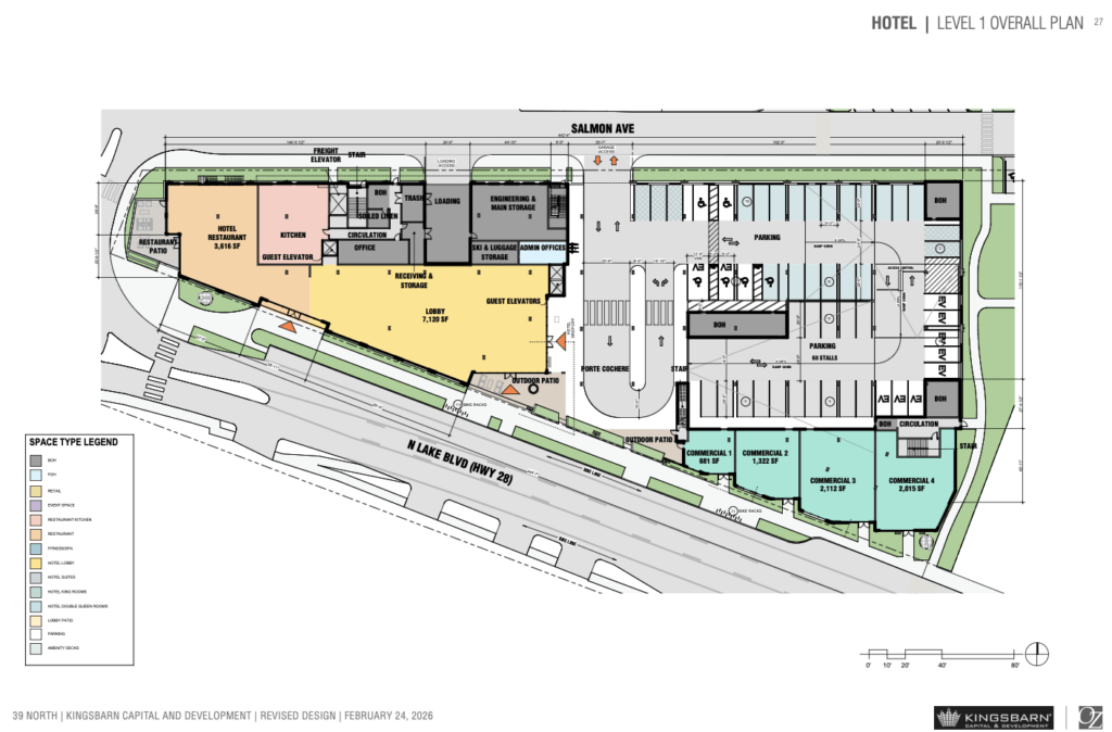 The largest portion of the project is a hotel and commercial building located along North Lake Boulevard near the Raccoon Street roundabout, one of the primary gateways into Kings Beach’s commercial core. The proposed hotel would include 132 guest rooms, along with ground-floor retail and restaurant space designed to activate the street frontage along the highway corridor.